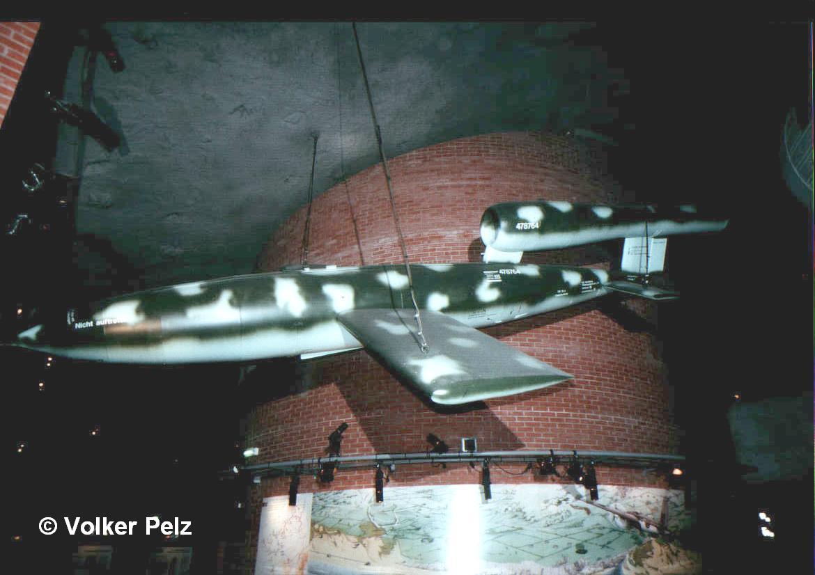 V1 exposé initiallement au musée de Meudon, un type différent avec un nez plus court que ses homologues mais qui ne semble pas répondre au type ''short noise'' décris dans certains documents d'archives. S'agit-il d'une mauvaise renovation ou d'un engin qui serait une copie pour une exposition ? Nous pouvons mentionner également que ses couleurs ne sont pas d'époque car les V1 n'ont jamais eu de croix noires sur leur fuselage et encore moins de croix gammées.